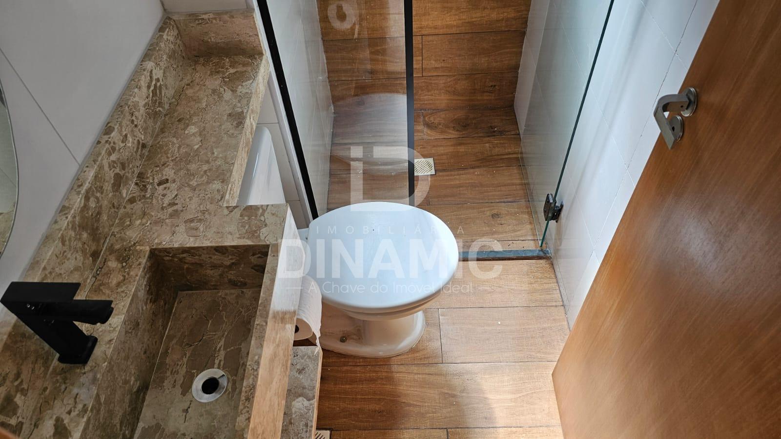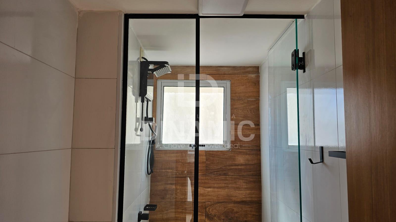 Banheiro social com pia em mármore, acabamento black piano, chuveiro Lorenzetti Black e box até o teto